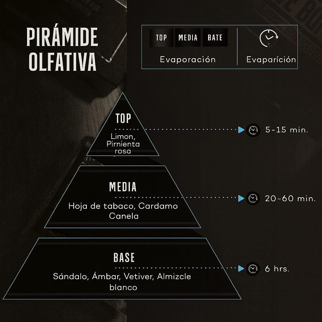 Lima, pimienta rosa y galbanum, hoja de tabaco, cardamomo, canela, ámbar, sándalo, vetiver y almizcle blanco.